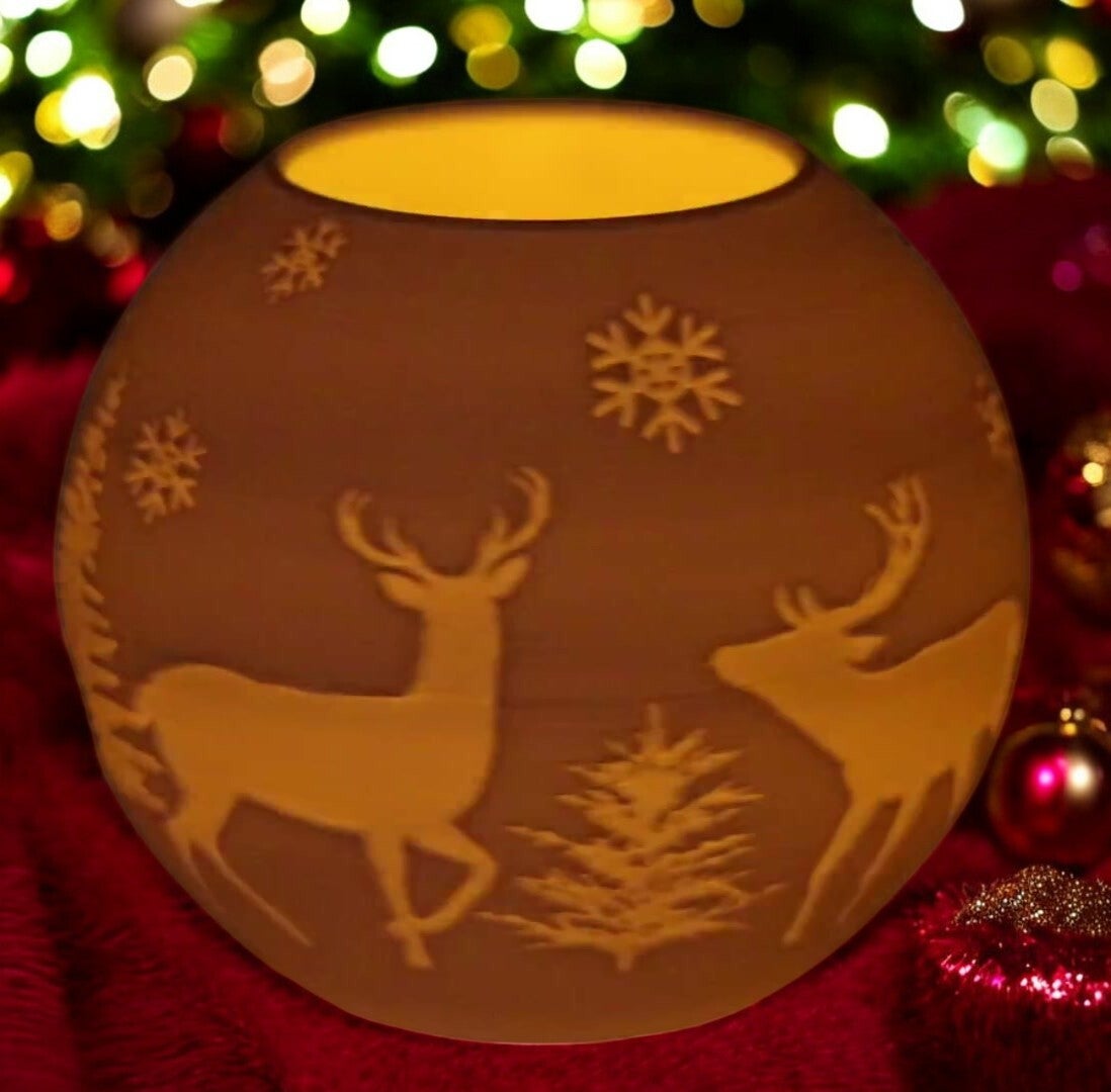 Teelichthalter Kugelform im Weihnachtsdesign - Schneeflocken-Bäume-Rentiere v2
