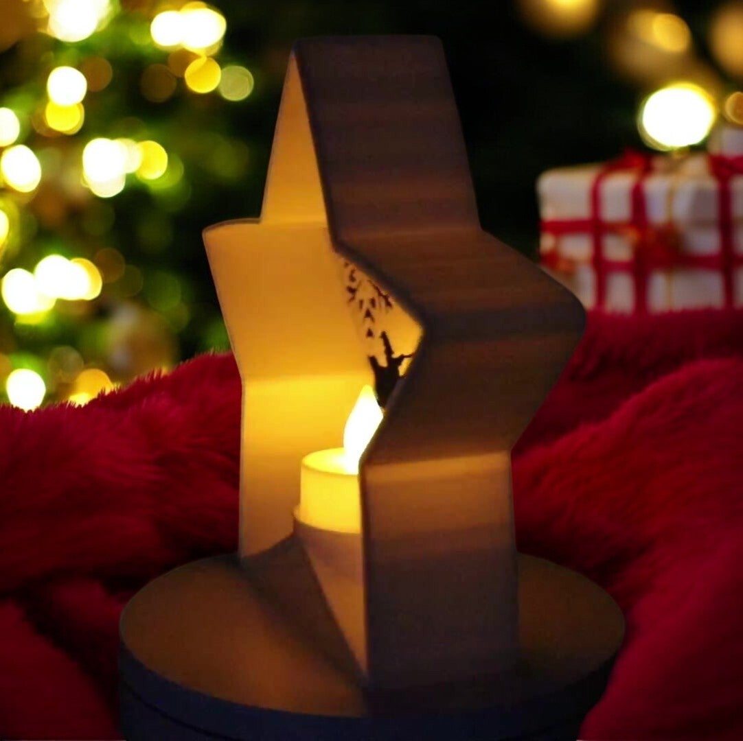 Teelichthalter Sternform im Weihnachtsdesign - Schnee-Schlitten-Rentiere-Waldlandschaft