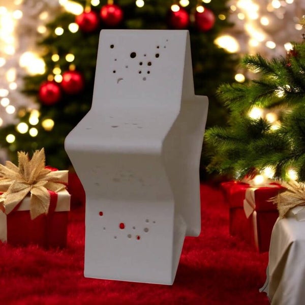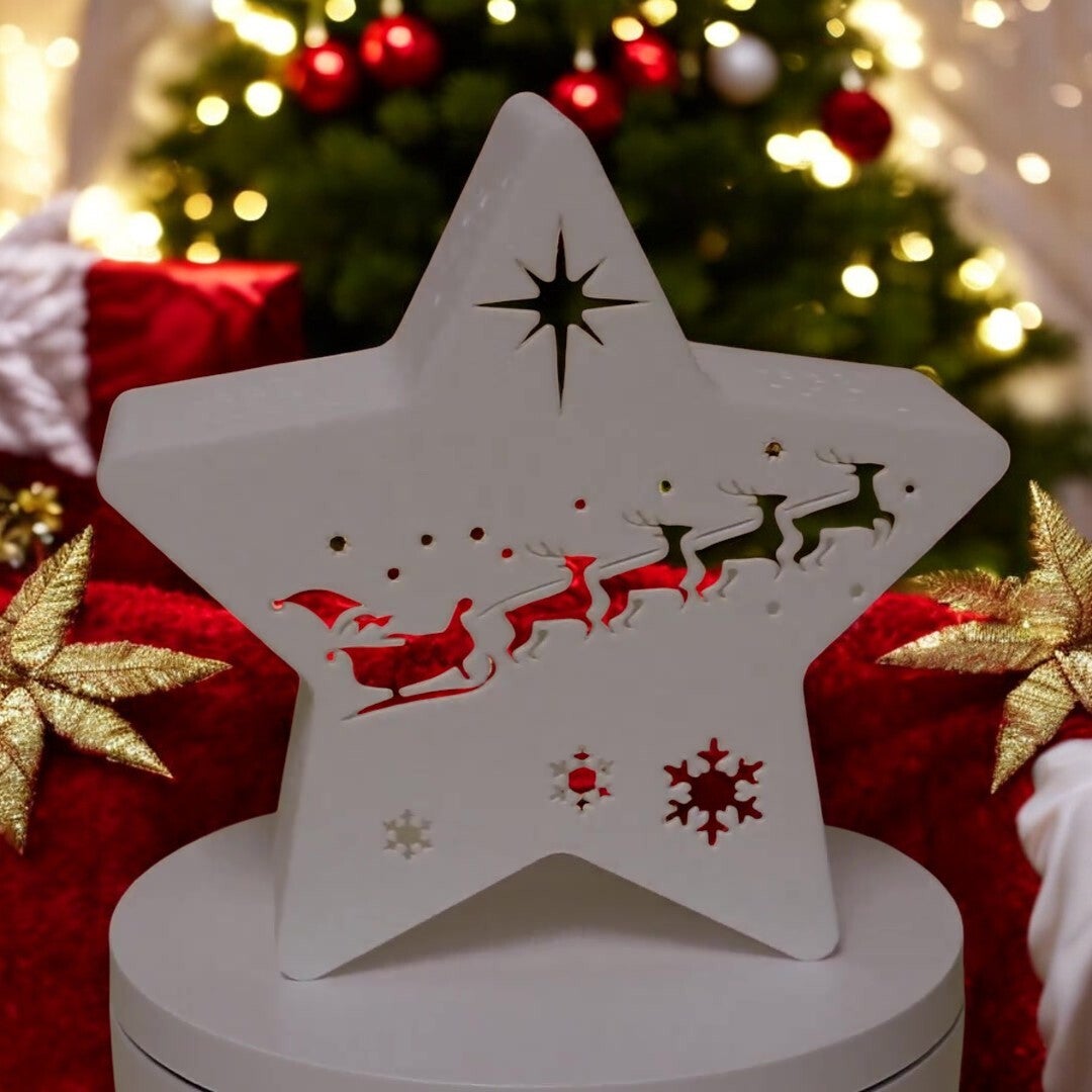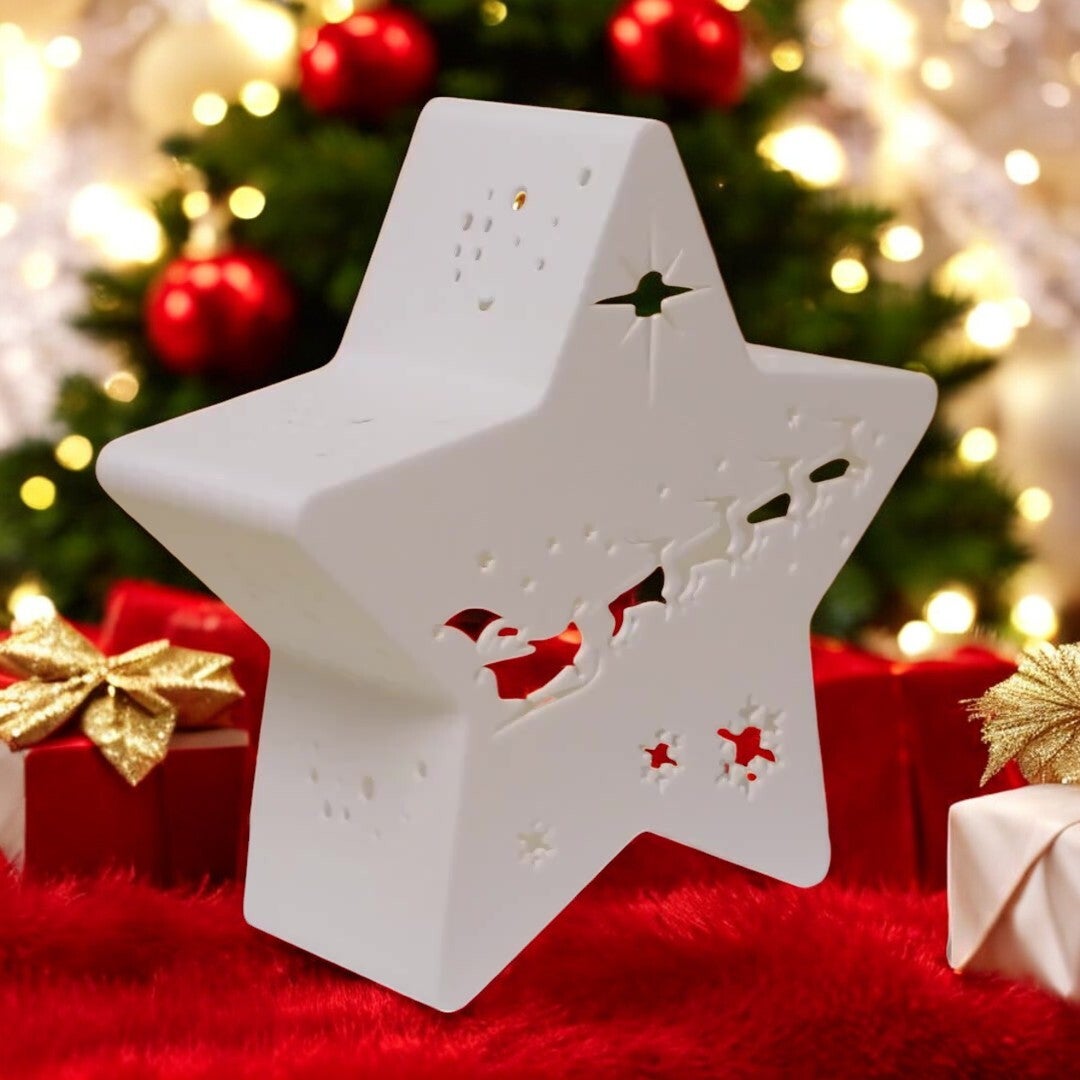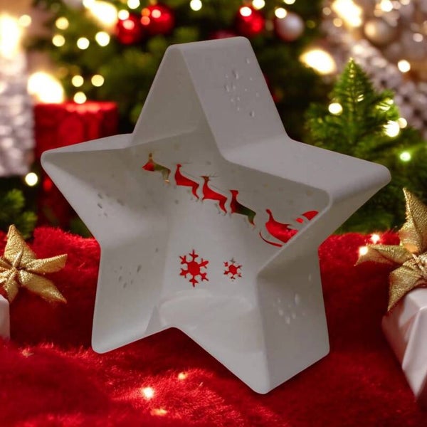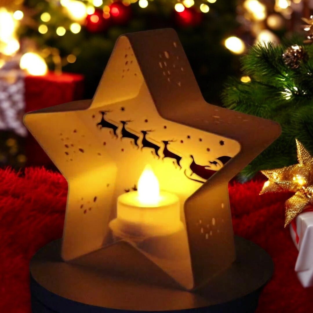 Teelichthalter Sternform im Weihnachtsdesign - Schlitten-Rentiere-Schneeflocken